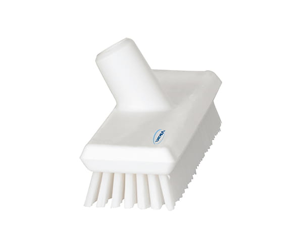 Szczotka Vikan 70415 z przepływem wody, przeznaczona jest do usuwania uporczywego, lepkiego brudu na małych powierzchniach, w szczególności w rzeźniach i zakładach przetwórstwa mięsnego. Szczotka posiada krótkie i bardzo twarde włosie.